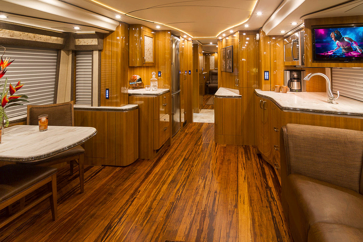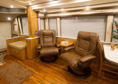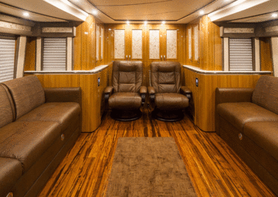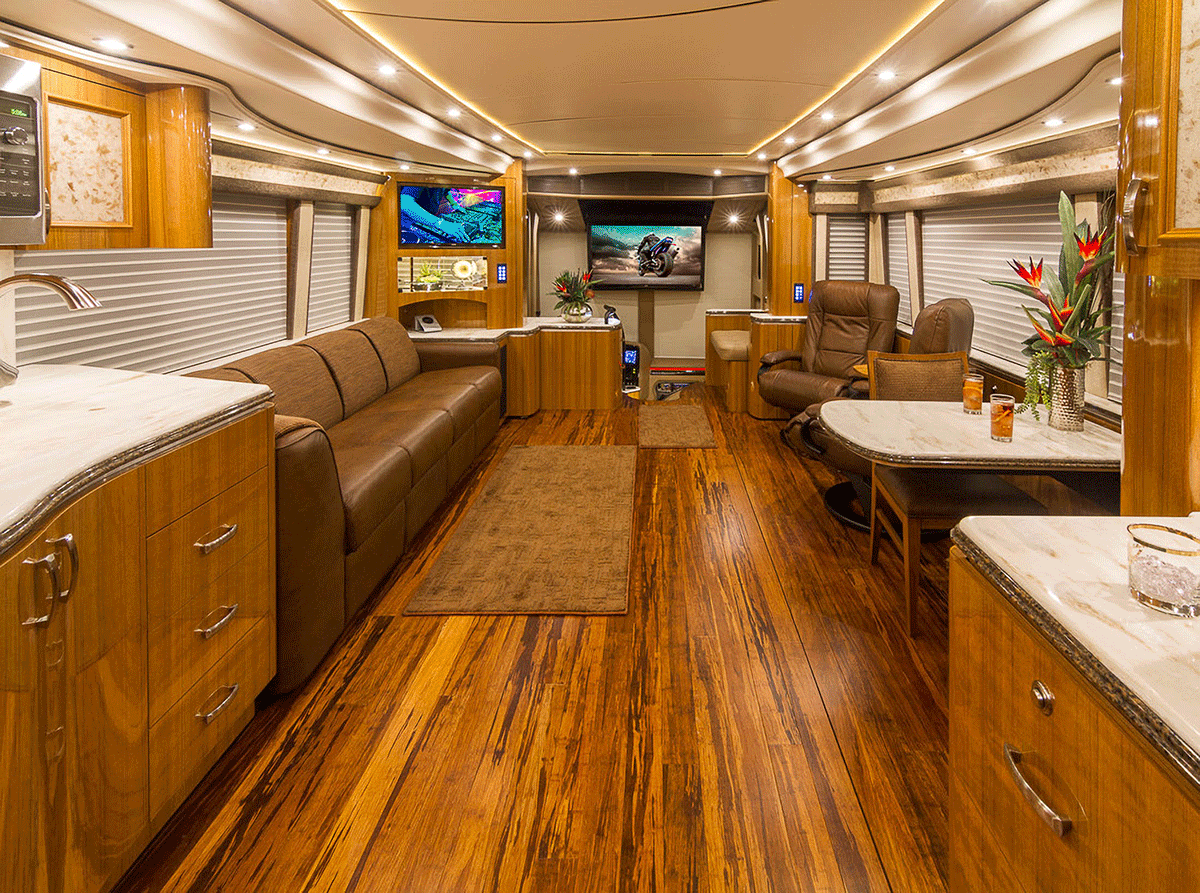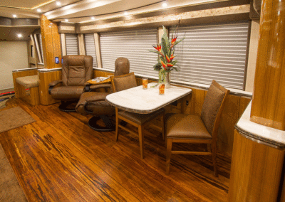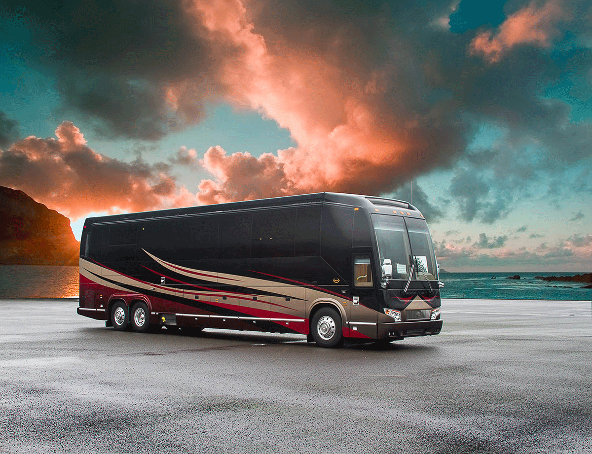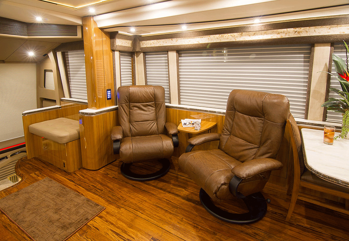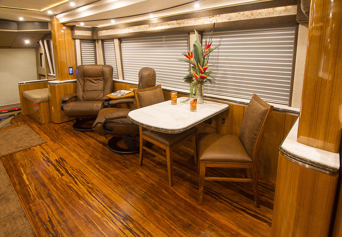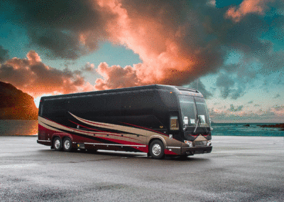 A true luxury executive suite on wheels. This 45-foot custom Prevost Marathon is fully appointed with everything you need for your Executive Team, clients or colleague to travel in style. Great for hospitality, meeting space or onsite support to an event. For the most discerning executive and their guests.