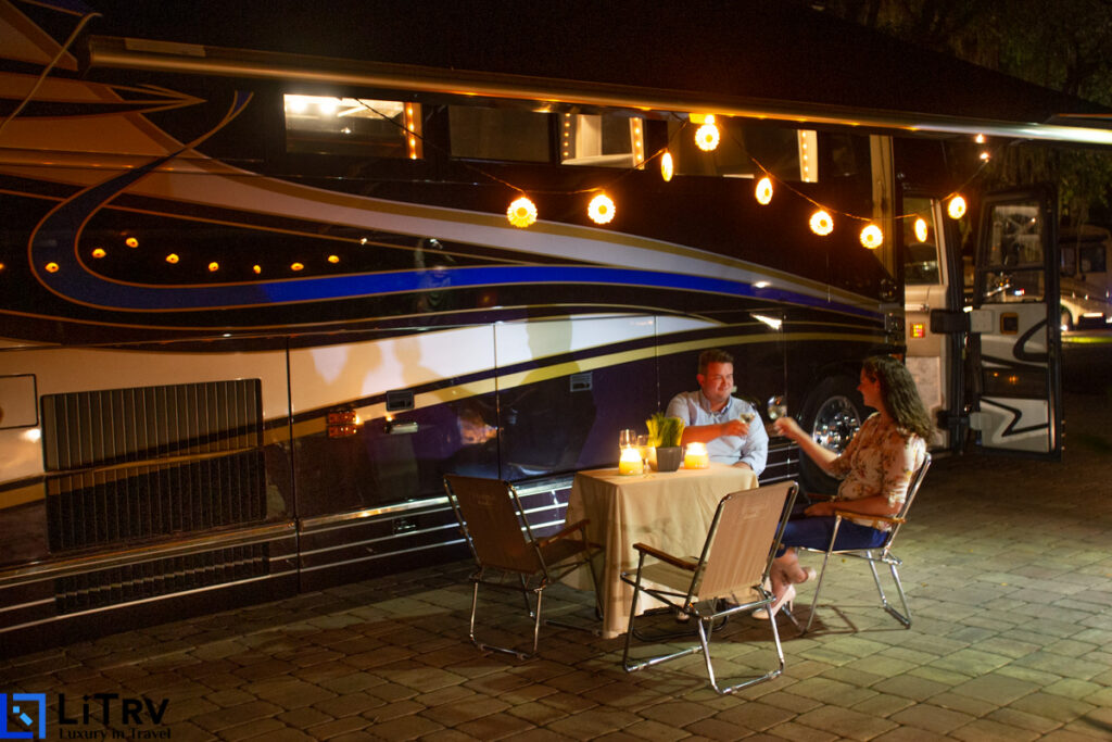 Our LiTRV team can also reserve a premier site at a luxury RV resort that includes a full outside kitchen with integrated audio and video entertainment centers.