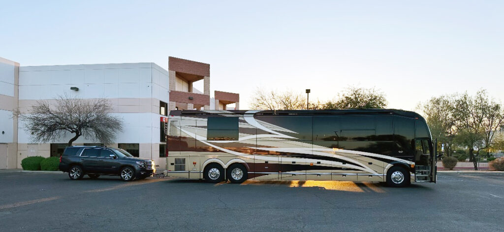 Much like a luxury hotel suite, a luxury motorcoach features the convenience of an expansive kitchen, comfortable beds, and multiple bathrooms. Some motorcoaches have electric fireplaces, heated floors, and state-of-the-art entertainment centers. There’s also plenty of room for pets to stretch out and relax and ample room for luggage. All luxury motorcoaches have Smart TVs throughout and WIFI access.